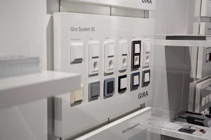 Bei den Küchengeräten wurde Wert auf intelligente Systeme gelegt. Schalter für den KNX, Sprechanlagen der Marken namhafter Hersteller sind auf Schautafeln in Funktion zu sehen. Hier können Sie fühlen und erleben.