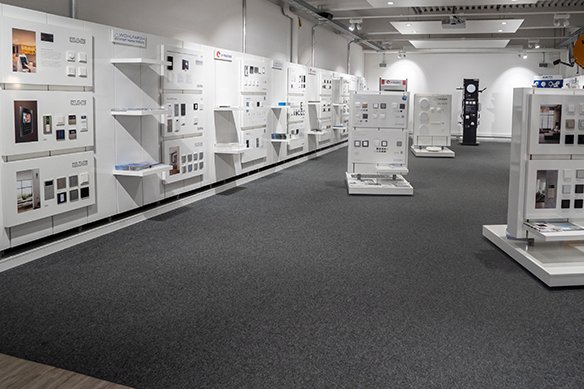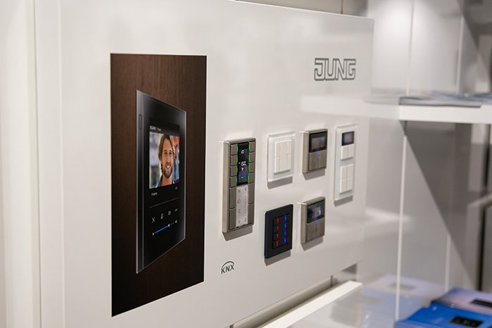 Bei den Küchengeräten wurde Wert auf intelligente Systeme gelegt. Schalter für den KNX, Sprechanlagen der Marken namhafter Hersteller sind auf Schautafeln in Funktion zu sehen. Hier können Sie fühlen und erleben.